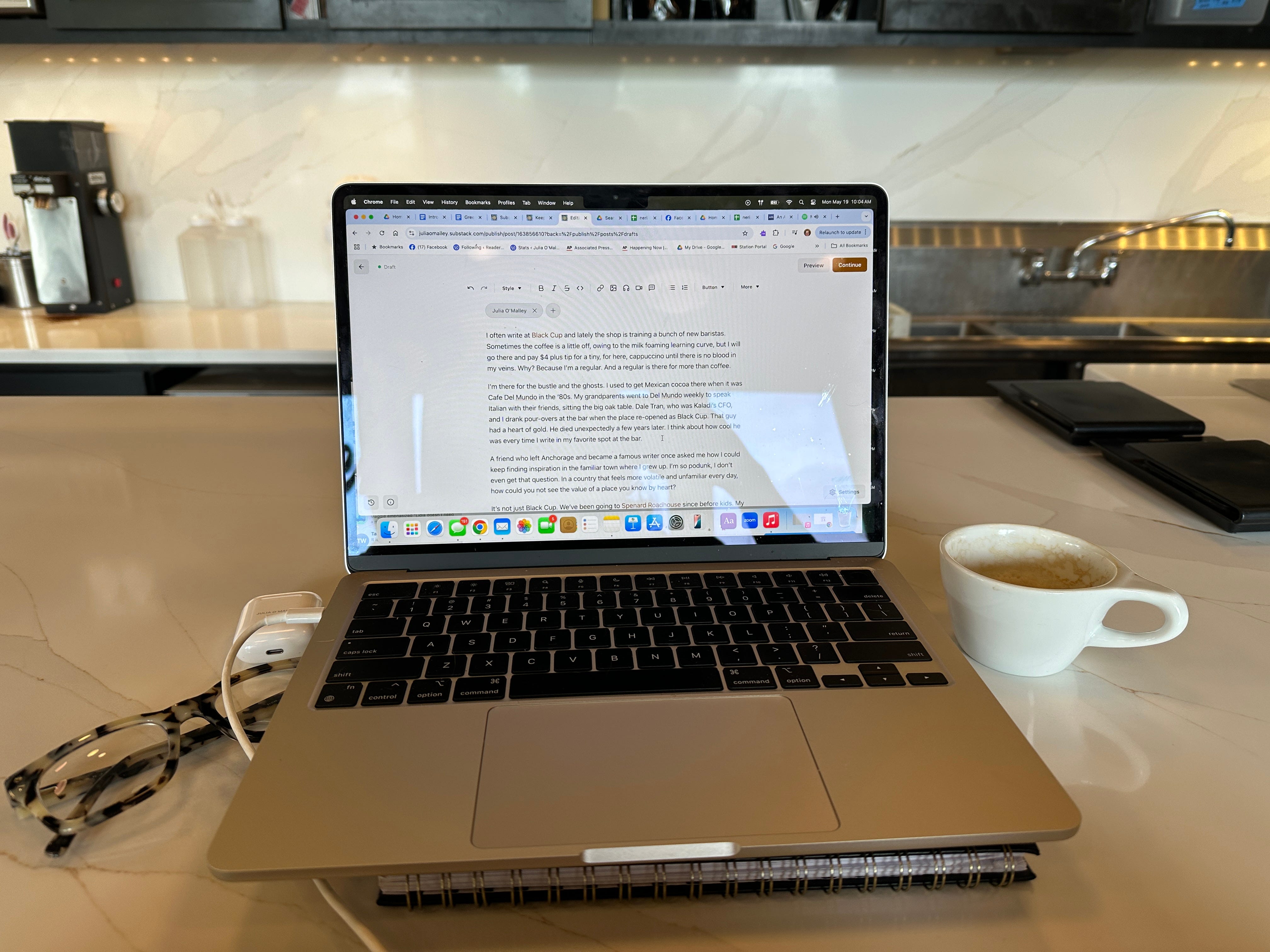 I show up for the bustle and the ghosts. I used to get Mexican cocoa there when it was Cafe Del Mundo in the ‘80s. My grandparents went to Del Mundo weekly to speak Italian with their friends, sitting at the big oak table. Dale Tran, who was Kaladi’s CFO, and I drank pour-overs at the bar when the place reopened as Black Cup. That guy had a heart of gold. He died unexpectedly a few years later. I think about how cool he was every time I write in my favorite spot at the bar.