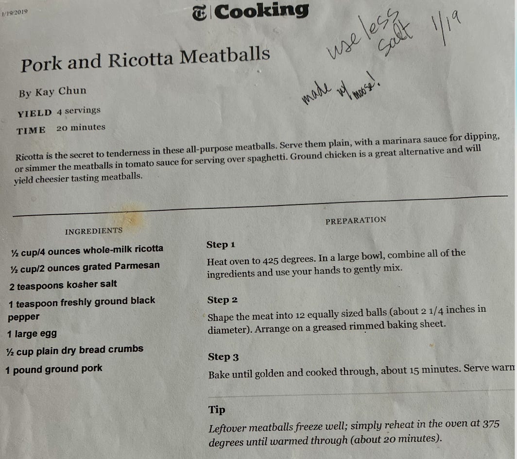 What’s for dinner: My friends, it’s French onion soup with a side of total ‘80s Anchorage nostalgia. I went down what my friend Fran calls a memory wormhole, thinking about eating French onion soup as a kid at long-closed Harry’s Restaurant. Dark and boothy, the place used to be nestled in the Midtown Key Bank building. It was named for a Harry Truman, who, at 84, refused to leave when Mount St. Helens erupted in 1980 and did not survive. I wrote a tribute recipe for the Anchorage Daily News. (And found eight perfect soup bowls at the Midtown Goodwill!) Also, Aunt Ruthie sent me her favorite recipe for ricotta meatballs. Make an extra batch and freeze them, she said. I do what my Aunt Ruthie tells me. Also, she didn’t send a dumb link, she took a picture because she printed out the recipe. From this, we can all benefit: